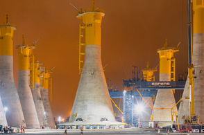 Les fondations gravitaires du parc éolien en mer de Fécamp. 71 fondations en béton de 50 mètres de haut et 5 500 tonnes construites sur le port du Havre. Un chantier et des moyens titanesques.